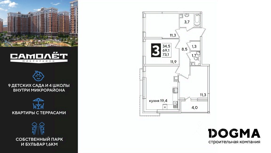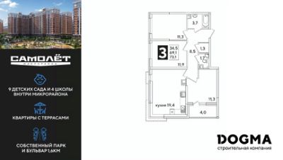 DOGMA - ТОП-3 застройщик по объему строительства в РФ. "САМОЛЁТ" — концептуальный жилой микрорайон, который расположен на северо-западе Краснодара, в районе Западного Обхода. Квартал спроектирован как "город в городе", поэтому здесь будет всё для комфортной жизни: современные дома с разными планировками, дороги, школы и детские сады, поликлиника, торговые центры, парки и аллеи. Микрорайон находится далеко от промышленных предприятий, сочетает удобство городской жизни и экологически благоприятную среду. Инфраструктура нового микрорайона: • 4 школы и 9 детских садов на территории микрорайона • Функциональные планировки • Собственный бульвар протяжённостью 1,6км • Светомузыкальный фонтан протяжённостью 55 метров • Амфитеатр • Парк 7 ГА • Скейт-парк • Детская аква-площадка • Круглосуточное видеонаблюдение и пост охраны Приобрести квартиру можно одним из способов: ипотека, рассрочка, наличный расчет.