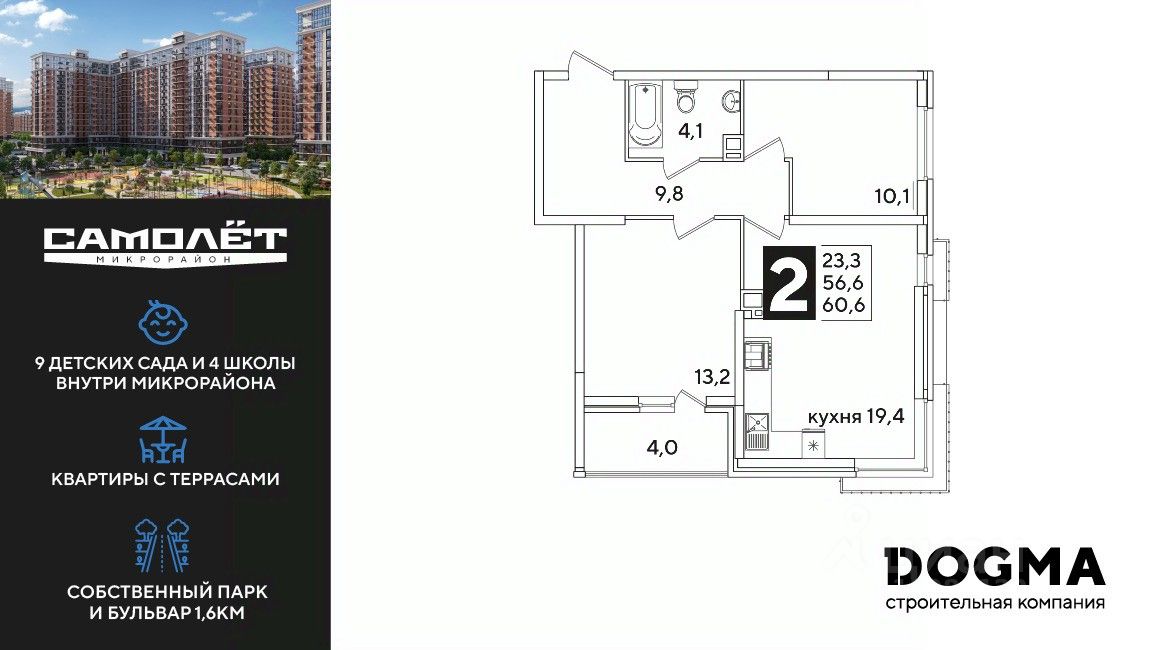 DOGMA - ТОП-3 застройщик по объему строительства в РФ. "САМОЛЁТ" — концептуальный жилой микрорайон, который расположен на северо-западе Краснодара, в районе Западного Обхода. Квартал спроектирован как "город в городе", поэтому здесь будет всё для комфортной жизни: современные дома с разными планировками, дороги, школы и детские сады, поликлиника, торговые центры, парки и аллеи. Микрорайон находится далеко от промышленных предприятий, сочетает удобство городской жизни и экологически благоприятную среду. Инфраструктура нового микрорайона: • 4 школы и 9 детских садов на территории микрорайона • Функциональные планировки • Собственный бульвар протяжённостью 1,6км • Светомузыкальный фонтан протяжённостью 55 метров • Амфитеатр • Парк 7 ГА • Скейт-парк • Детская аква-площадка • Круглосуточное видеонаблюдение и пост охраны Приобрести квартиру можно одним из способов: ипотека, рассрочка, наличный расчет.
