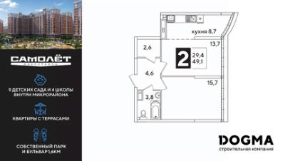 DOGMA - ТОП-3 застройщик по объему строительства в РФ. "САМОЛЁТ" — концептуальный жилой микрорайон, который расположен на северо-западе Краснодара, в районе Западного Обхода. Квартал спроектирован как "город в городе", поэтому здесь будет всё для комфортной жизни: современные дома с разными планировками, дороги, школы и детские сады, поликлиника, торговые центры, парки и аллеи. Микрорайон находится далеко от промышленных предприятий, сочетает удобство городской жизни и экологически благоприятную среду. Инфраструктура нового микрорайона: • 4 школы и 9 детских садов на территории микрорайона • Функциональные планировки • Собственный бульвар протяжённостью 1,6км • Светомузыкальный фонтан протяжённостью 55 метров • Амфитеатр • Парк 7 ГА • Скейт-парк • Детская аква-площадка • Круглосуточное видеонаблюдение и пост охраны Приобрести квартиру можно одним из способов: ипотека, рассрочка, наличный расчет.