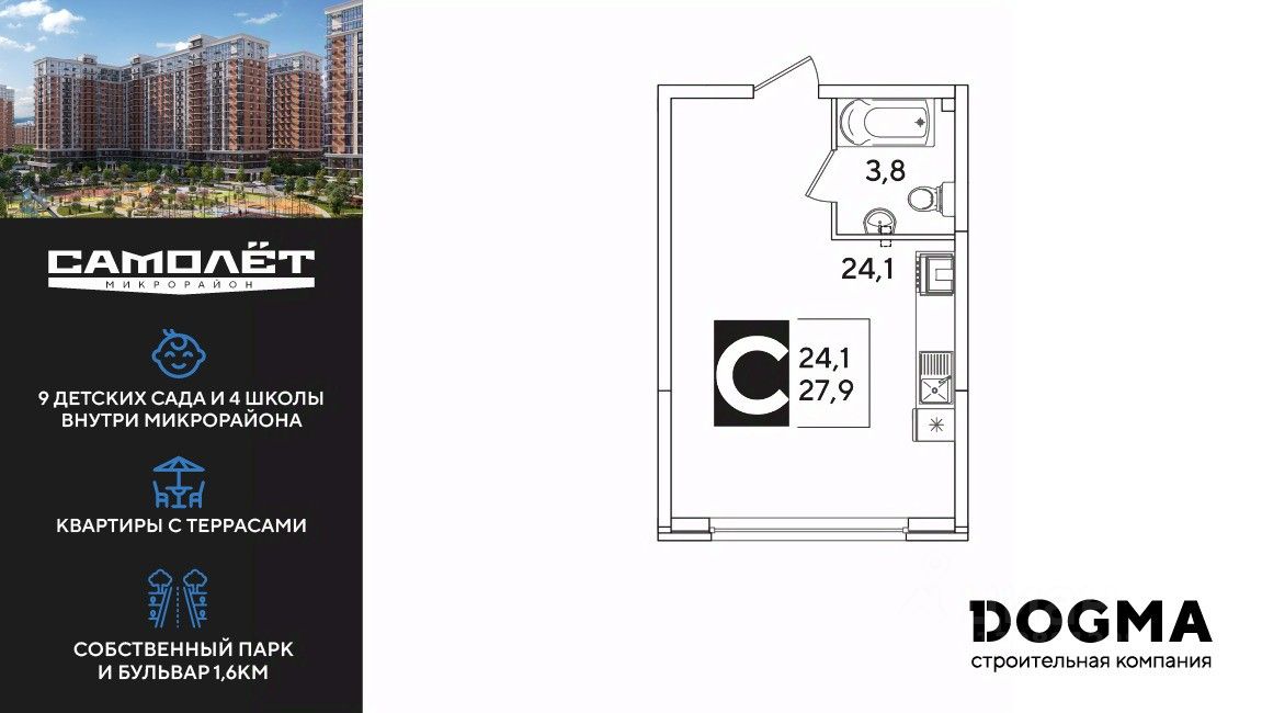 DOGMA - ТОП-3 застройщик по объему строительства в РФ. "САМОЛЁТ" — концептуальный жилой микрорайон, который расположен на северо-западе Краснодара, в районе Западного Обхода. Квартал спроектирован как "город в городе", поэтому здесь будет всё для комфортной жизни: современные дома с разными планировками, дороги, школы и детские сады, поликлиника, торговые центры, парки и аллеи. Микрорайон находится далеко от промышленных предприятий, сочетает удобство городской жизни и экологически благоприятную среду. Инфраструктура нового микрорайона: • 4 школы и 9 детских садов на территории микрорайона • Функциональные планировки • Собственный бульвар протяжённостью 1,6км • Светомузыкальный фонтан протяжённостью 55 метров • Амфитеатр • Парк 7 ГА • Скейт-парк • Детская аква-площадка • Круглосуточное видеонаблюдение и пост охраны Приобрести квартиру можно одним из способов: ипотека, рассрочка, наличный расчет.