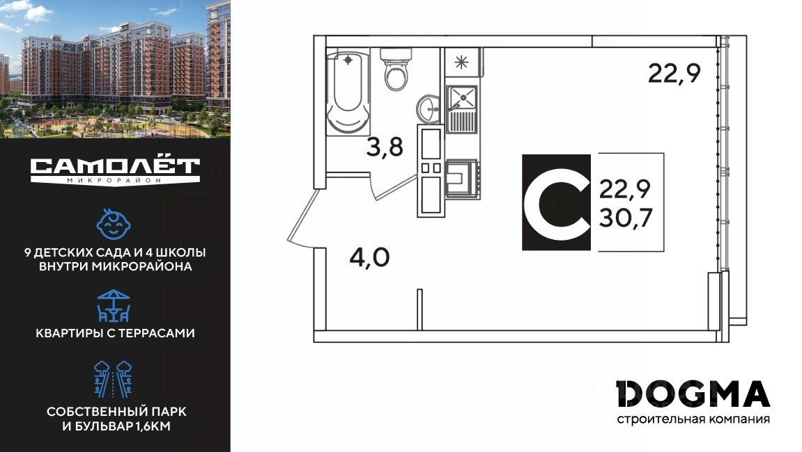 DOGMA - ТОП-3 застройщик по объему строительства в РФ. "САМОЛЁТ" — концептуальный жилой микрорайон, который расположен на северо-западе Краснодара, в районе Западного Обхода. Квартал спроектирован как "город в городе", поэтому здесь будет всё для комфортной жизни: современные дома с разными планировками, дороги, школы и детские сады, поликлиника, торговые центры, парки и аллеи. Микрорайон находится далеко от промышленных предприятий, сочетает удобство городской жизни и экологически благоприятную среду. Инфраструктура нового микрорайона: • 4 школы и 9 детских садов на территории микрорайона • Функциональные планировки • Собственный бульвар протяжённостью 1,6км • Светомузыкальный фонтан протяжённостью 55 метров • Амфитеатр • Парк 7 ГА • Скейт-парк • Детская аква-площадка • Круглосуточное видеонаблюдение и пост охраны Приобрести квартиру можно одним из способов: ипотека, рассрочка, наличный расчет.