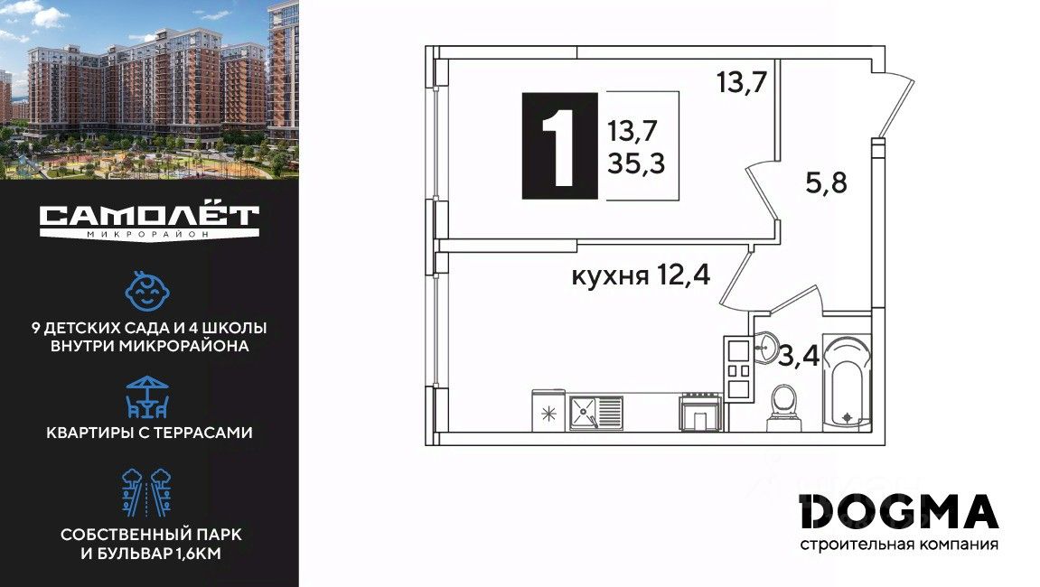 DOGMA - ТОП-3 застройщик по объему строительства в РФ. "САМОЛЁТ" — концептуальный жилой микрорайон, который расположен на северо-западе Краснодара, в районе Западного Обхода. Квартал спроектирован как "город в городе", поэтому здесь будет всё для комфортной жизни: современные дома с разными планировками, дороги, школы и детские сады, поликлиника, торговые центры, парки и аллеи. Микрорайон находится далеко от промышленных предприятий, сочетает удобство городской жизни и экологически благоприятную среду. Инфраструктура нового микрорайона: • 4 школы и 9 детских садов на территории микрорайона • Функциональные планировки • Собственный бульвар протяжённостью 1,6км • Светомузыкальный фонтан протяжённостью 55 метров • Амфитеатр • Парк 7 ГА • Скейт-парк • Детская аква-площадка • Круглосуточное видеонаблюдение и пост охраны Приобрести квартиру можно одним из способов: ипотека, рассрочка, наличный расчет.