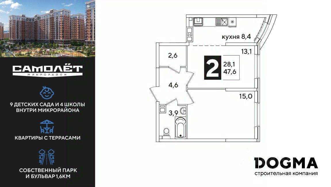 DOGMA - ТОП-3 застройщик по объему строительства в РФ. "САМОЛЁТ" — концептуальный жилой микрорайон, который расположен на северо-западе Краснодара, в районе Западного Обхода. Квартал спроектирован как "город в городе", поэтому здесь будет всё для комфортной жизни: современные дома с разными планировками, дороги, школы и детские сады, поликлиника, торговые центры, парки и аллеи. Микрорайон находится далеко от промышленных предприятий, сочетает удобство городской жизни и экологически благоприятную среду. Инфраструктура нового микрорайона: • 4 школы и 9 детских садов на территории микрорайона • Функциональные планировки • Собственный бульвар протяжённостью 1,6км • Светомузыкальный фонтан протяжённостью 55 метров • Амфитеатр • Парк 7 ГА • Скейт-парк • Детская аква-площадка • Круглосуточное видеонаблюдение и пост охраны Приобрести квартиру можно одним из способов: ипотека, рассрочка, наличный расчет.
