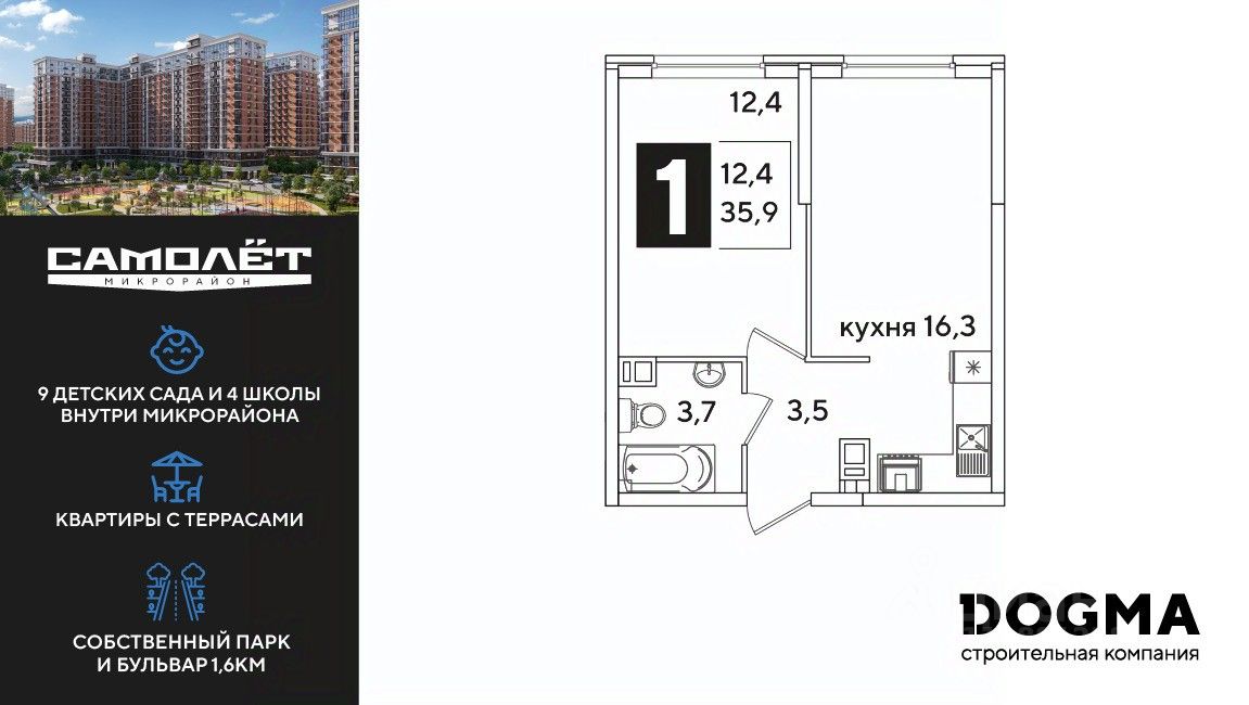 DOGMA - ТОП-3 застройщик по объему строительства в РФ. "САМОЛЁТ" — концептуальный жилой микрорайон, который расположен на северо-западе Краснодара, в районе Западного Обхода. Квартал спроектирован как "город в городе", поэтому здесь будет всё для комфортной жизни: современные дома с разными планировками, дороги, школы и детские сады, поликлиника, торговые центры, парки и аллеи. Микрорайон находится далеко от промышленных предприятий, сочетает удобство городской жизни и экологически благоприятную среду. Инфраструктура нового микрорайона: • 4 школы и 9 детских садов на территории микрорайона • Функциональные планировки • Собственный бульвар протяжённостью 1,6км • Светомузыкальный фонтан протяжённостью 55 метров • Амфитеатр • Парк 7 ГА • Скейт-парк • Детская аква-площадка • Круглосуточное видеонаблюдение и пост охраны Приобрести квартиру можно одним из способов: ипотека, рассрочка, наличный расчет.