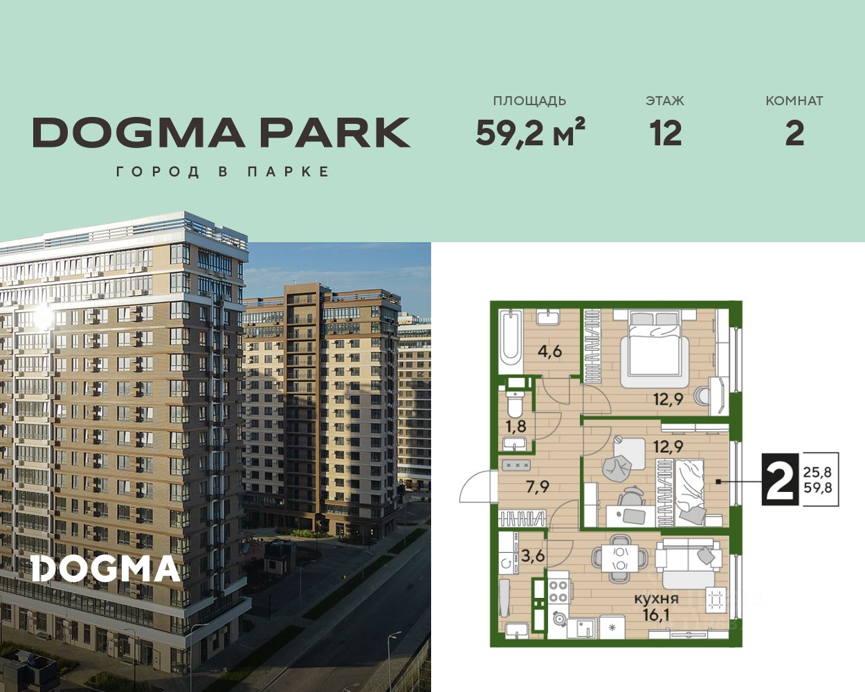 В продаже 2-комнатная квартира от застройщика! Мкр. "DOGMA PARK" г. Краснодар, Литер 7 Срок сдачи: 4 кв. 2026, общей площадью 59.2 кв.м., на 12 этаже.