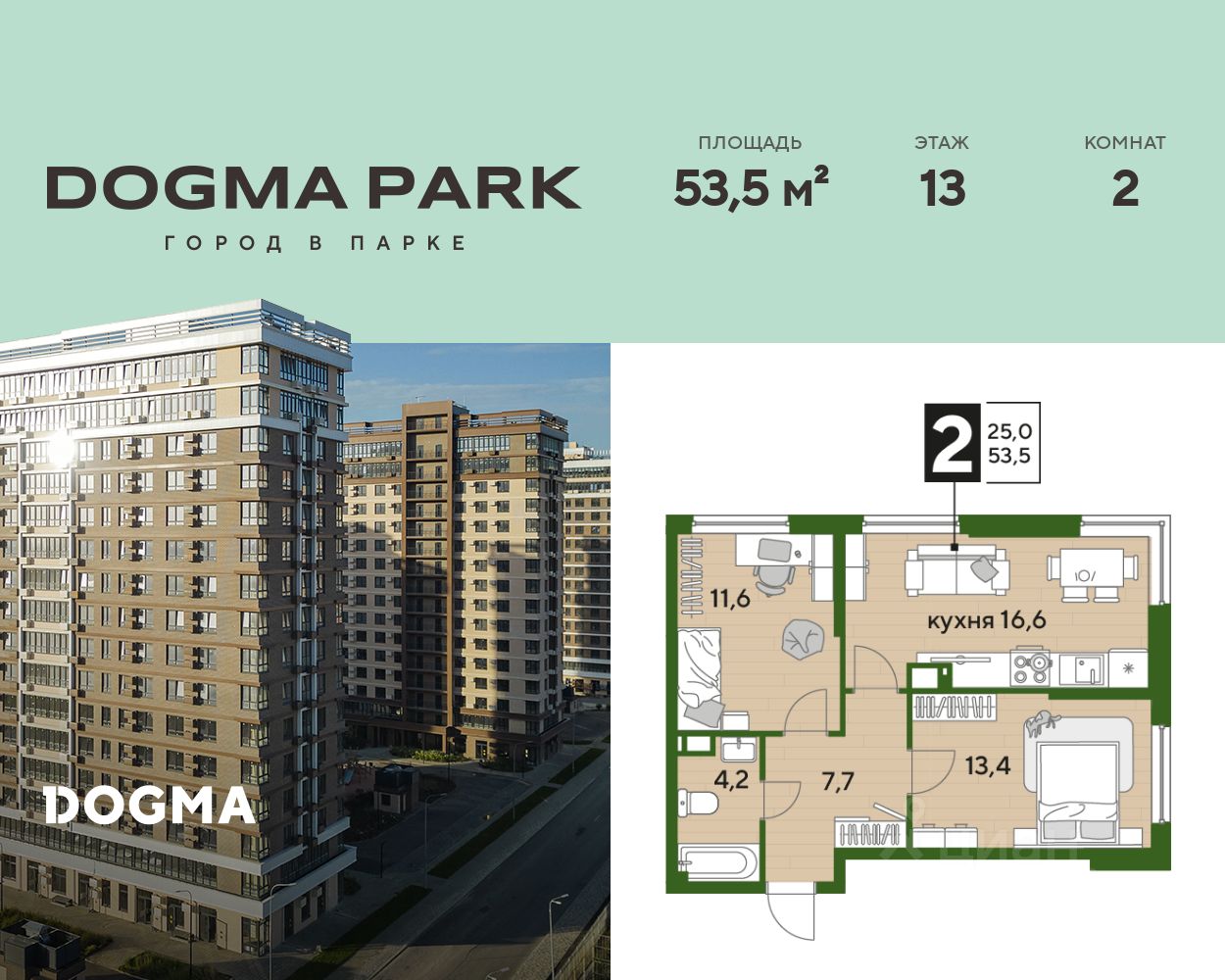 В продаже 2-комнатная квартира от застройщика! Мкр. "DOGMA PARK" г. Краснодар, Литер 22 Срок сдачи: 4 кв. 2027, общей площадью 53.5 кв.м., на 13 этаже.