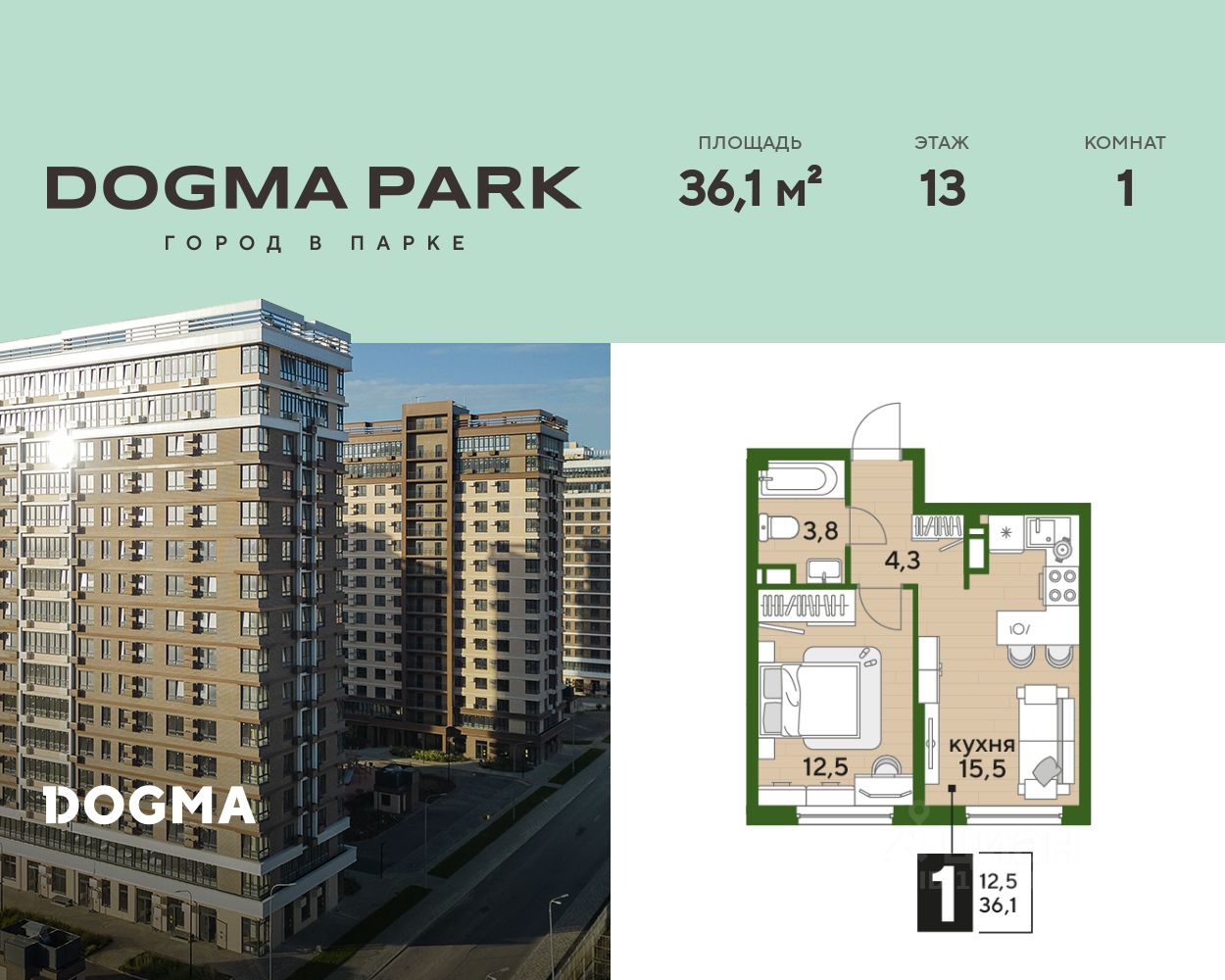 В продаже 1-комнатная квартира от застройщика! Мкр. "DOGMA PARK" г. Краснодар, Литер 18 Срок сдачи: 4 кв. 2027, общей площадью 36.1 кв.м., на 13 этаже.