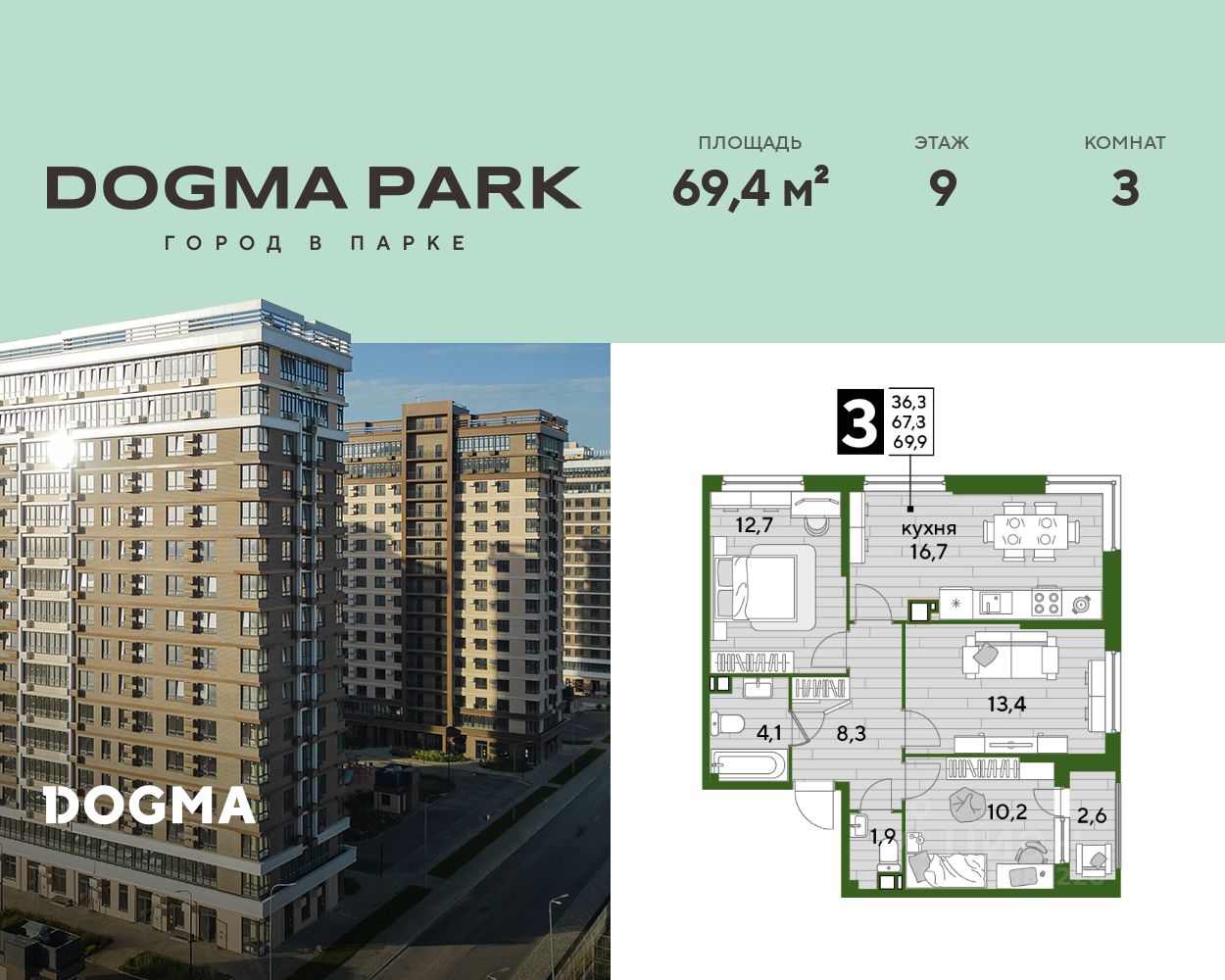 В продаже 3-комнатная квартира от застройщика! Мкр. "DOGMA PARK" г. Краснодар, Литер 9 Срок сдачи: 4 кв. 2026, общей площадью 69.4 кв.м., на 9 этаже.