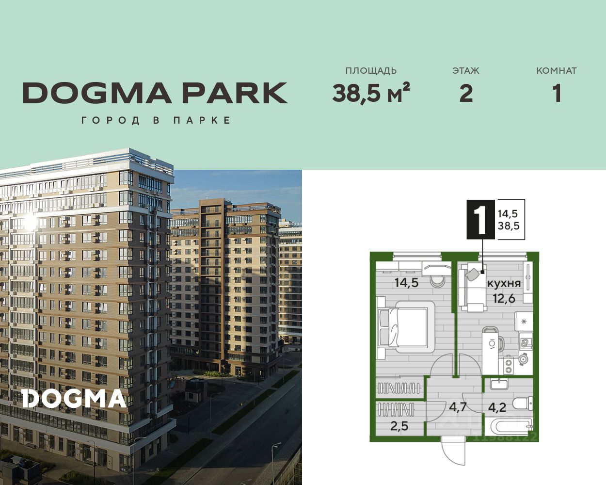 В продаже 1-комнатная квартира от застройщика! Мкр. "DOGMA PARK" г. Краснодар, Литер 5 Срок сдачи: 4 кв. 2026, общей площадью 38.5 кв.м., на 2 этаже.