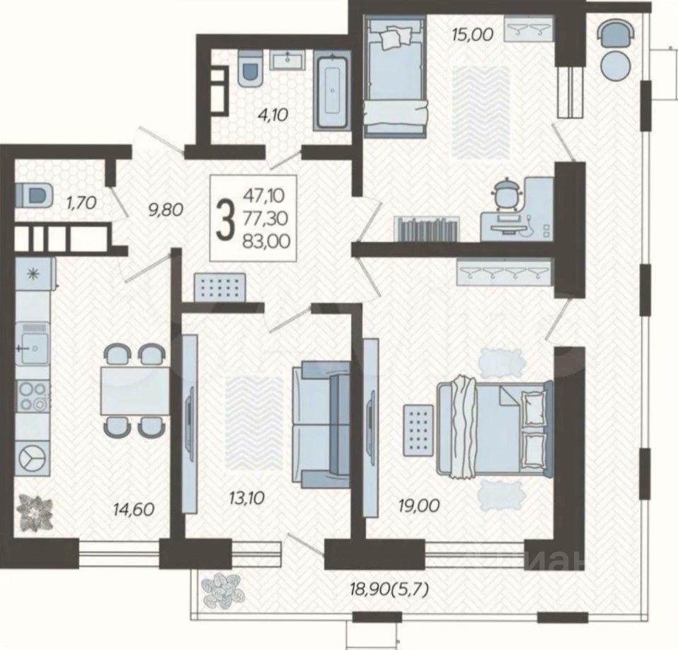 Семейная планировка: 3 изолированные комнаты + кухня-гостиная 14 м²