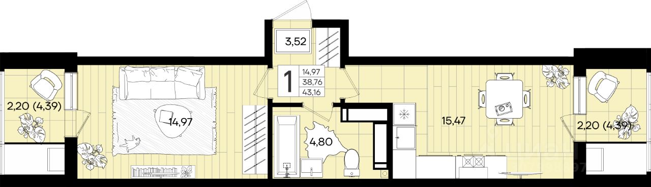 Высота потолков до 3,9 м наполняет пространство светом и воздухом, создавая ощущение свободы.