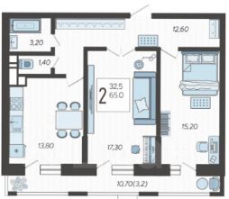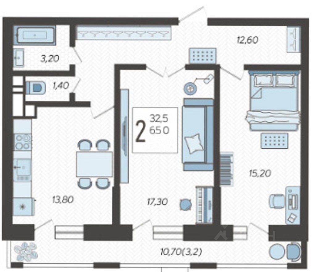 Семейная планировка: 2 изолированные комнаты + кухня-гостиная 14 м²