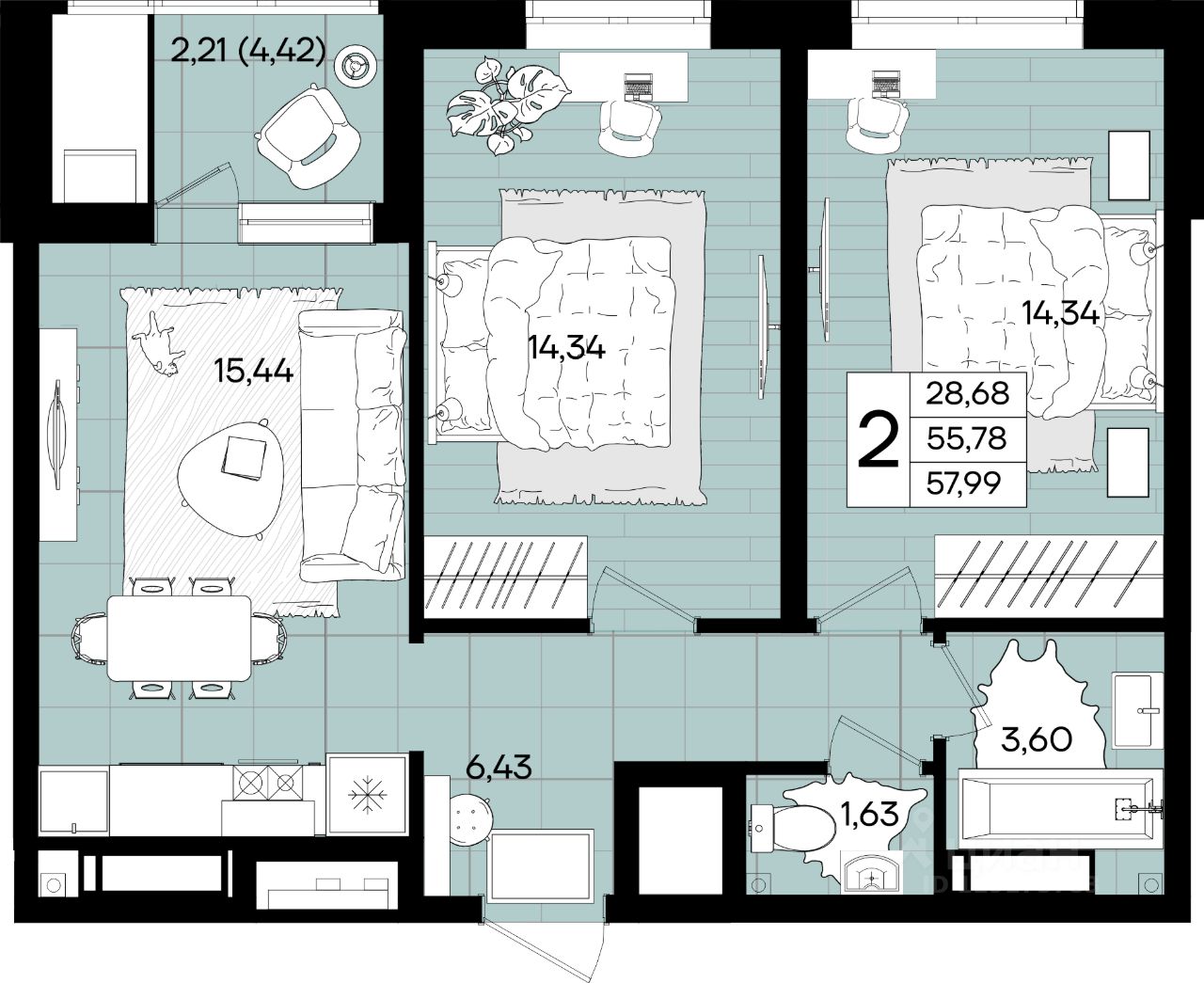 Общая площадь57,99 м²