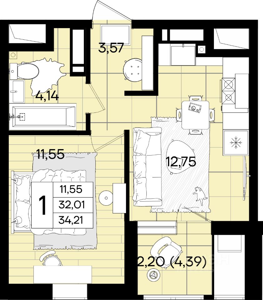 Высота потолков до 3,9 м наполняет пространство светом и воздухом, создавая ощущение свободы.