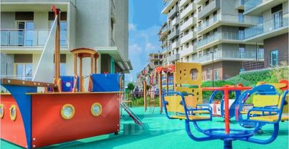 На закрытой территории комплекса расположены несколько детских площадок для любого возраста. Оборудована бесплатная зона с бассейном и лежаками, душем и туалетом. Дежурит спасатель. Есть магазины и кафе на пляже.