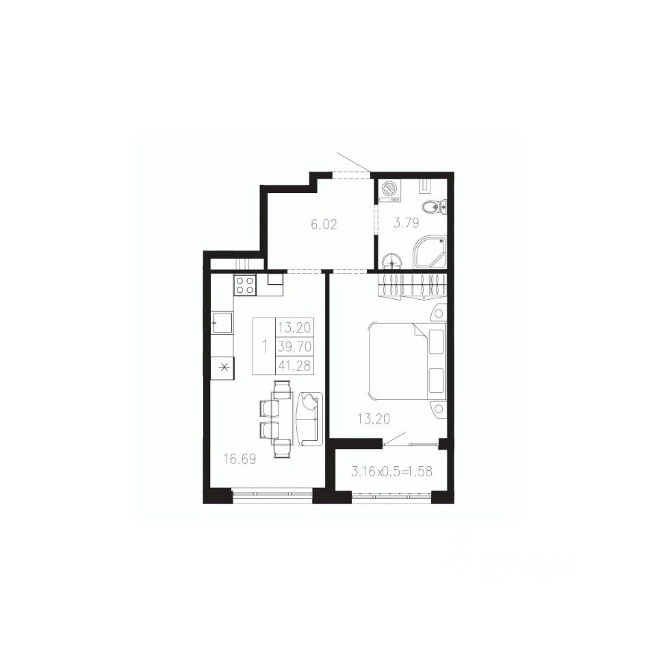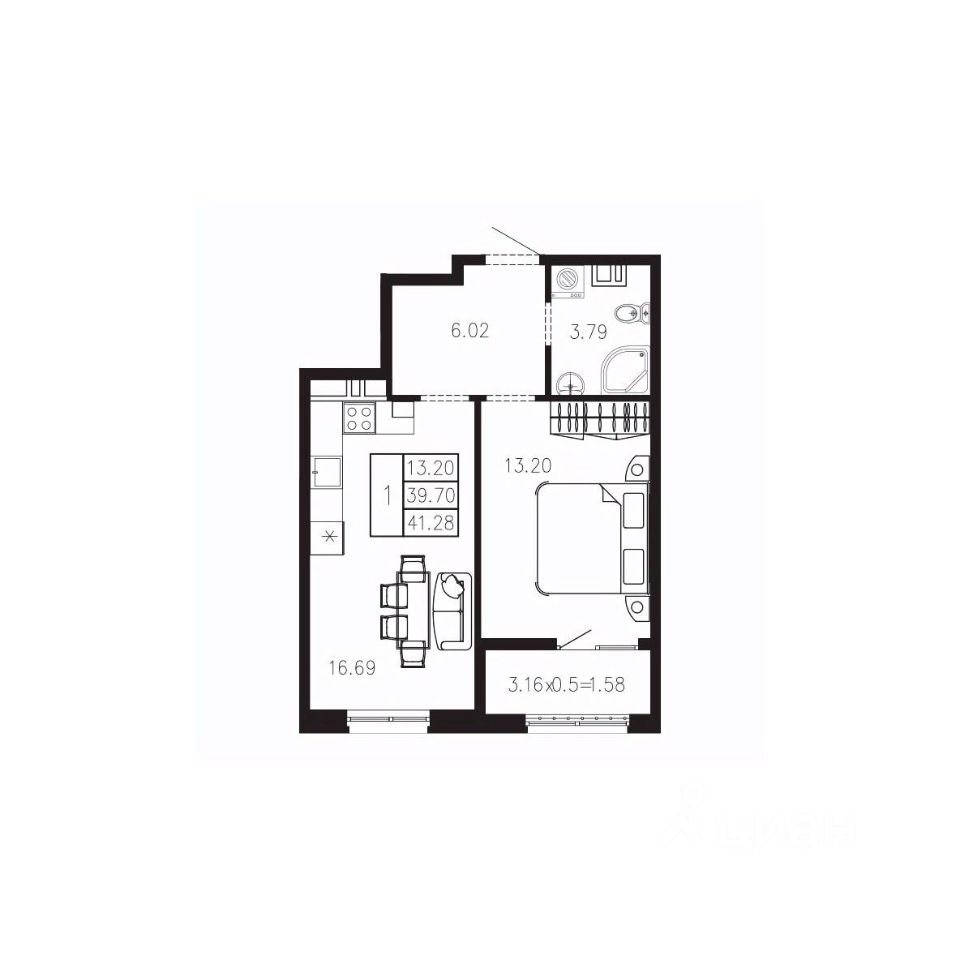 Общая площадь41,28 м²