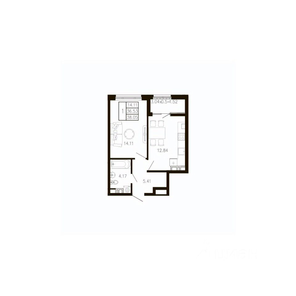 Общая площадь38,05 м²