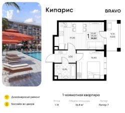 Продаётся 1-комн. квартира от застройщика c отделкой в ЖК "Кипарис" на 1 этаже. Общая площадь:36.8 кв.м., площадь просторной кухни-столовой:17.2. B квартире один балкон. Высота потолков 2.81 м.