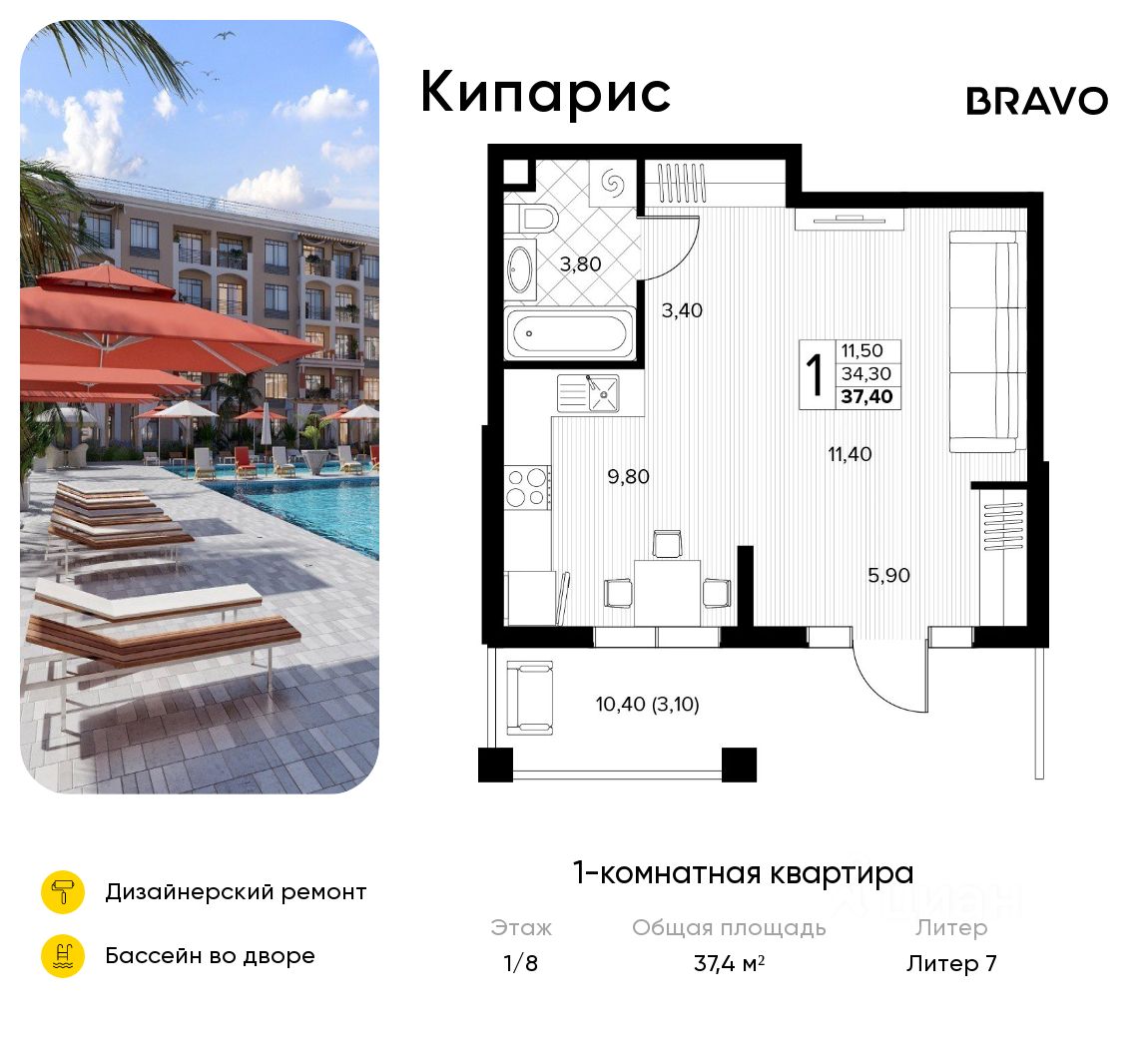 Продаётся 1-комн. квартира от застройщика c отделкой в ЖК "Кипарис" на 1 этаже. Общая площадь:37.4 кв.м., площадь просторной кухни-столовой:9.8. B квартире один балкон. Высота потолков 2.81 м.
