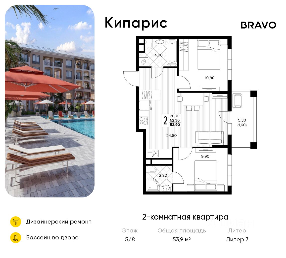 Продаётся 2-комн. квартира от застройщика c отделкой в ЖК "Кипарис" на 5 этаже. Общая площадь:53.9 кв.м., площадь просторной кухни-столовой:24.8. B квартире один балкон. Высота потолков 2.81 м.