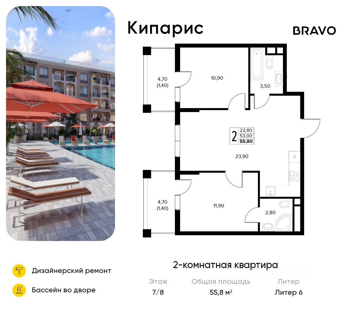 Продаётся 2-комн. квартира от застройщика c отделкой в ЖК "Кипарис" на 7 этаже. Общая площадь:55.8 кв.м., площадь просторной кухни-столовой:23.9. B квартире один балкон. Высота потолков 2.81 м.