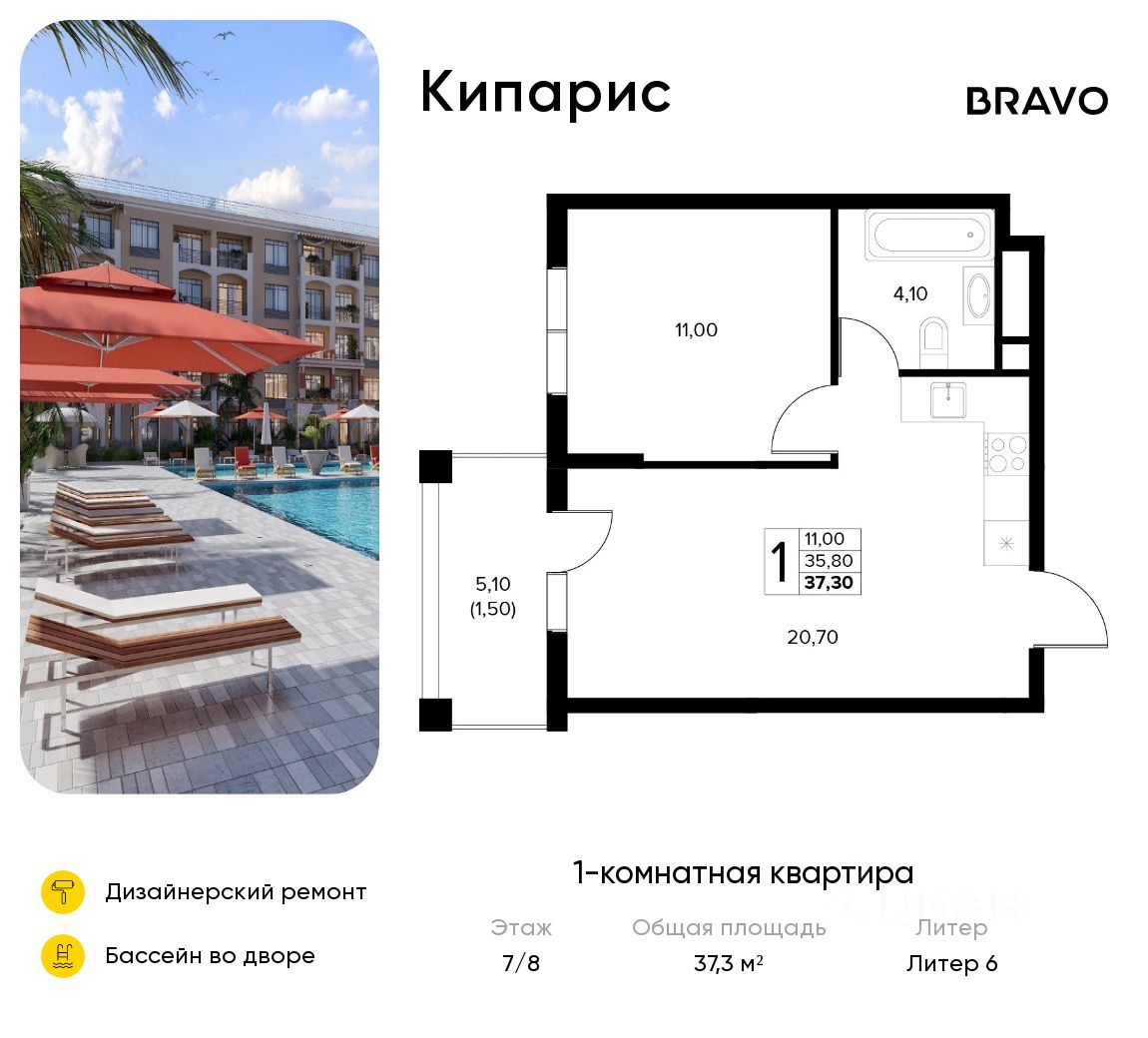 Продаётся 1-комн. квартира от застройщика c отделкой в ЖК "Кипарис" на 7 этаже. Общая площадь:37.3 кв.м., площадь просторной кухни-столовой:20.7. B квартире один балкон. Высота потолков 2.81 м.