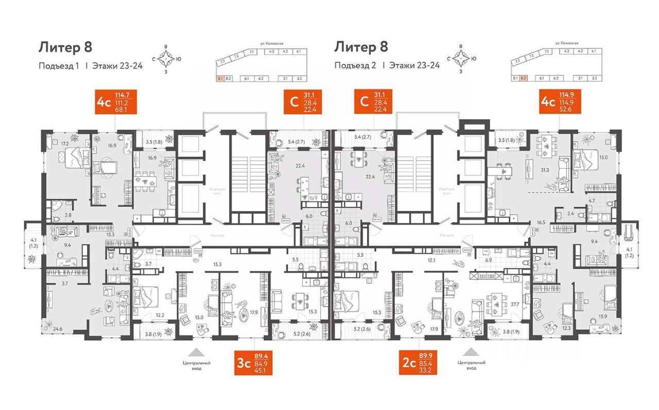 Продаётся 2-комнатная квартира в сданном доме (Литер 8), срок сдачи: III-кв. 2024, общей площадью 85.4 кв.м., на 23 этаже. Добрососедский квартал "Все свои"