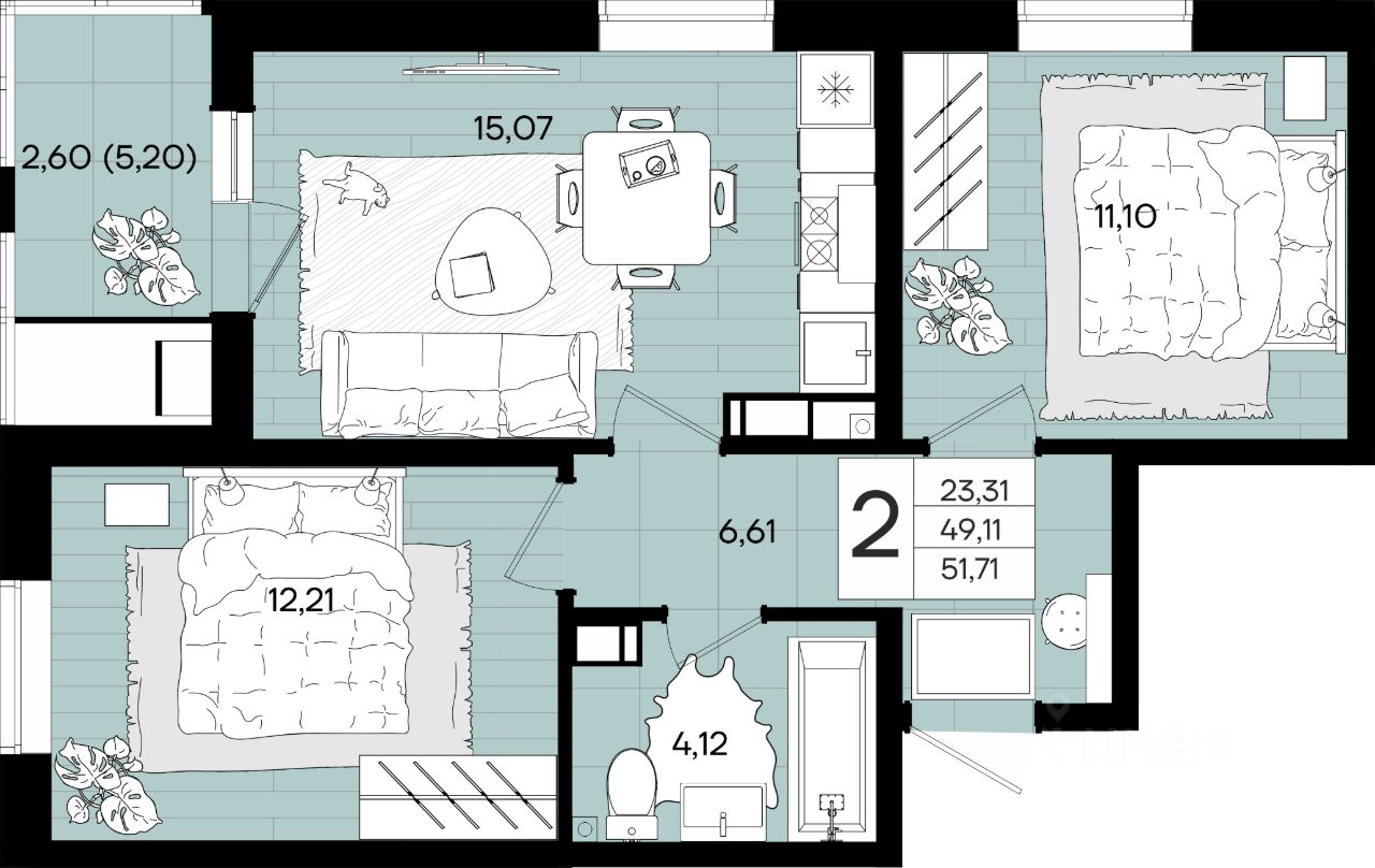 Общая площадь51,71 м²