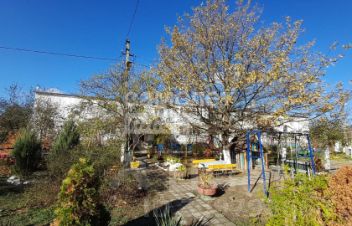Двор дома, ухоженный с плодовыми деревьями и оборудован детской площадкой.