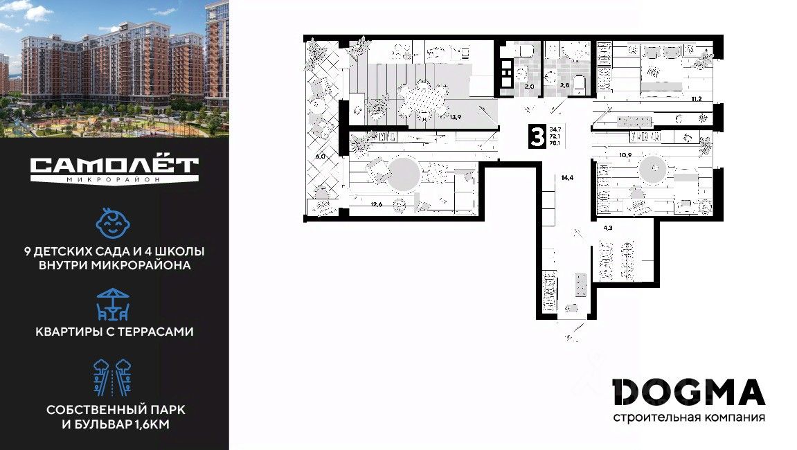 В продаже 3-комнатная квартира от застройщика! Мкр. "Самолет" 4 очередь, г. Краснодар, Литер 24 Срок сдачи: 2 кв. 2023, общей площадью 78.1 кв.м., на 4 этаже.