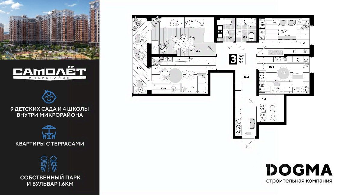 В продаже 3-комнатная квартира от застройщика! Мкр. "Самолет" 4 очередь, г. Краснодар, Литер 21 Срок сдачи: 4 кв. 2023, общей площадью 77.8 кв.м., на 12 этаже.