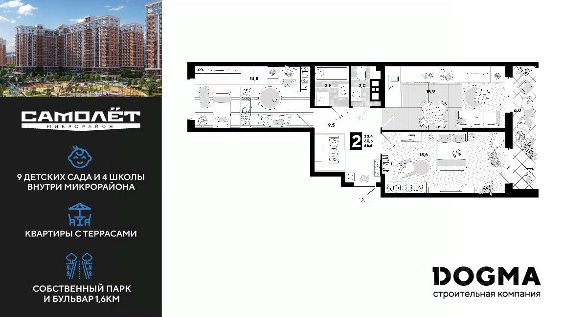 В продаже 2-комнатная квартира от застройщика! Мкр. "Самолет" 4 очередь, г. Краснодар, Литер 23 Срок сдачи: 2 кв. 2023, общей площадью 66.6 кв.м., на 3 этаже.