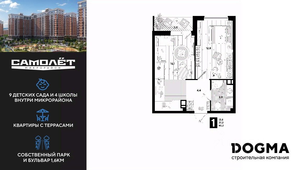 В продаже 1-комнатная квартира от застройщика! Мкр. "Самолет" 4 очередь, г. Краснодар, Литер 23 Срок сдачи: 2 кв. 2023, общей площадью 40.7 кв.м., на 2 этаже.