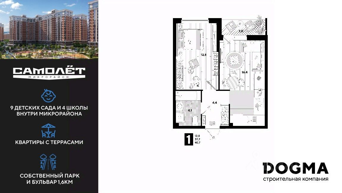 В продаже 1-комнатная квартира от застройщика! Мкр. "Самолет" 4 очередь, г. Краснодар, Литер 23 Срок сдачи: 2 кв. 2023, общей площадью 40.2 кв.м., на 3 этаже.