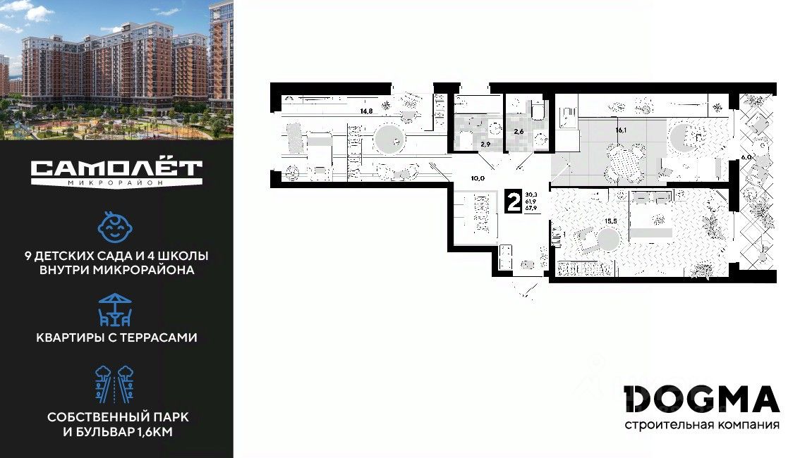 В продаже 2-комнатная квартира от застройщика! Мкр. "Самолет" 5 очередь, г. Краснодар, Литер 25 Срок сдачи: 2 кв. 2024, общей площадью 67.9 кв.м., на 2 этаже.
