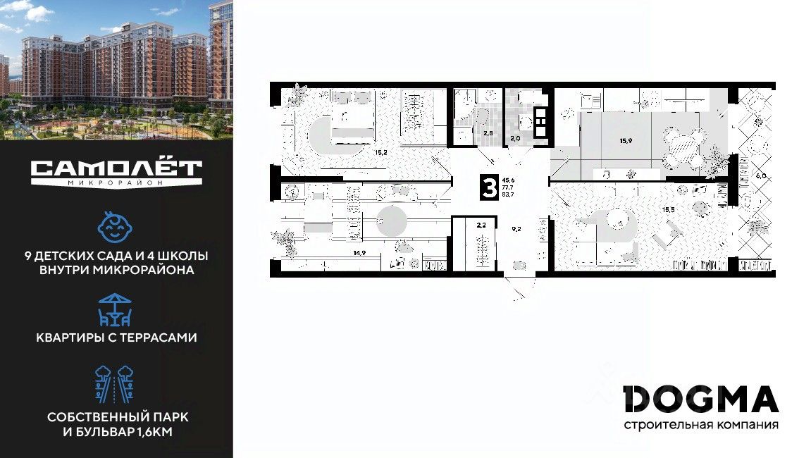 В продаже 3-комнатная квартира от застройщика! Мкр. "Самолет" 5 очередь, г. Краснодар, Литер 28 Срок сдачи: 2 кв. 2024, общей площадью 83.7 кв.м., на 5 этаже.