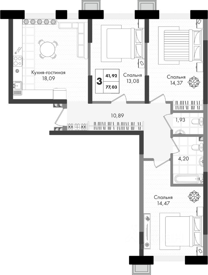 3-комнатная квартира с отапливаемой лоджией в жилом комплексе Зеленая территория от надежного застройщика СЗ Флагман в Краснодаре.