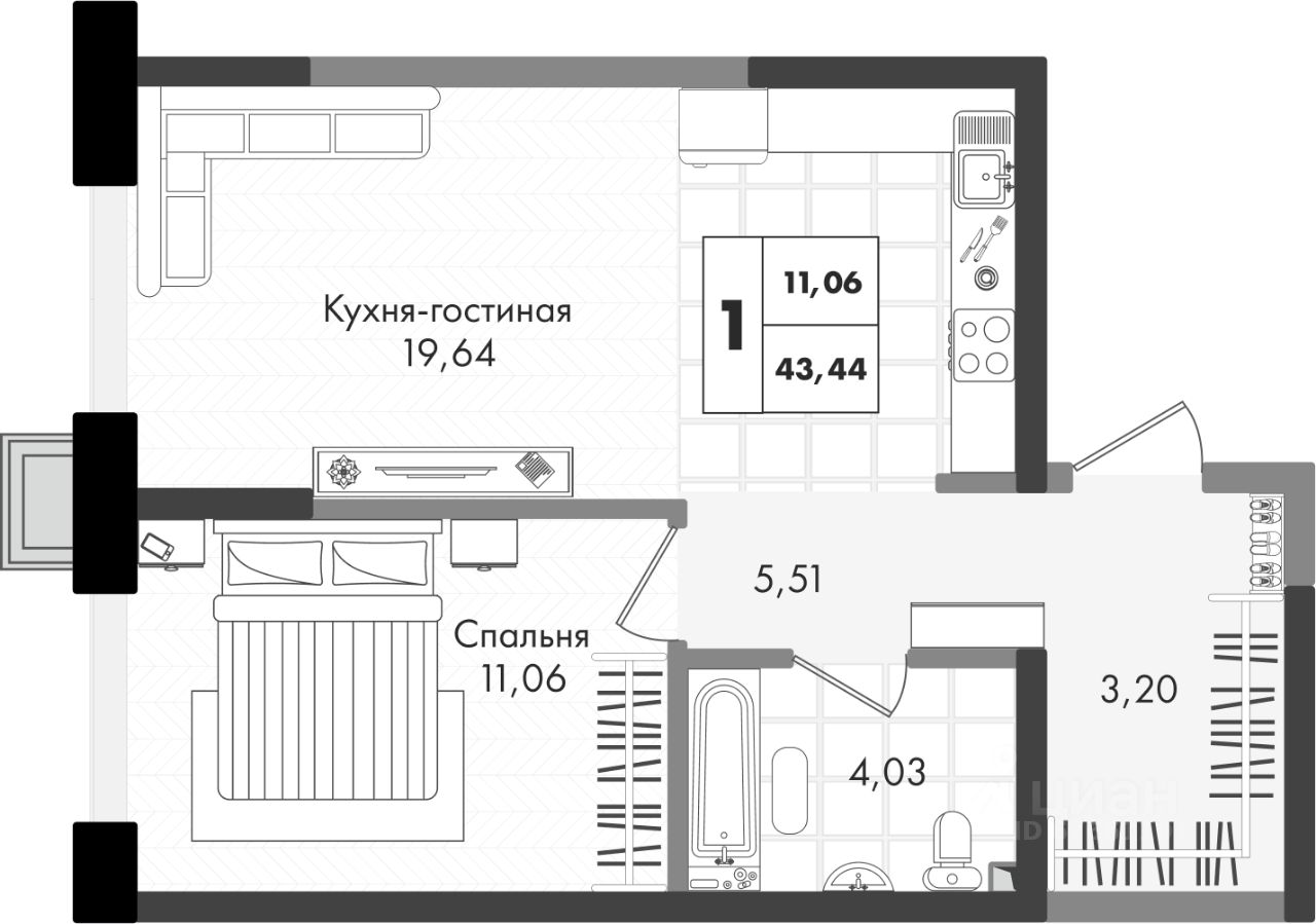 Общая площадь43,44 м²