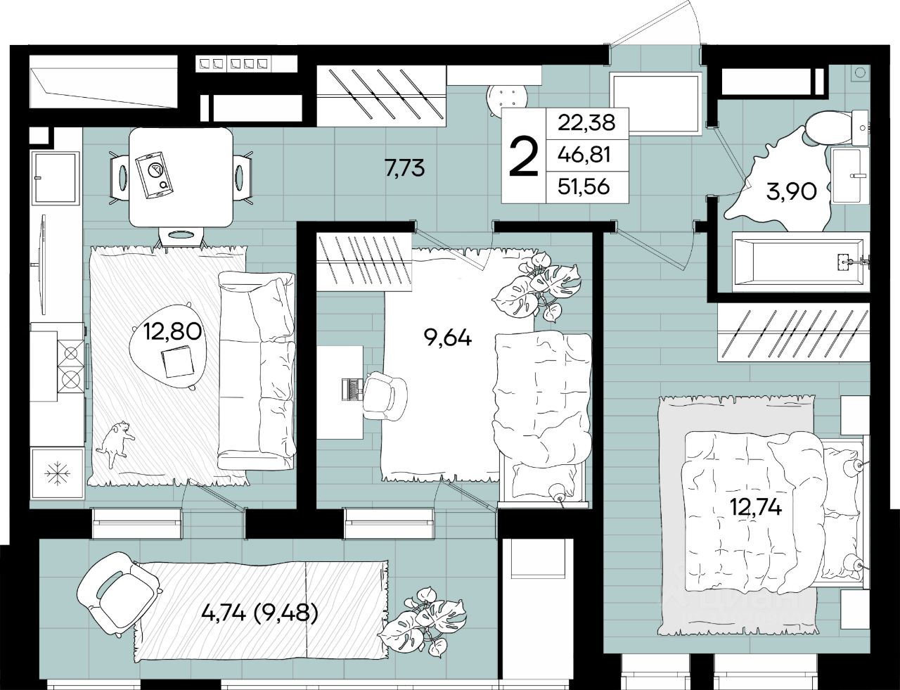 Общая площадь51,94 м²