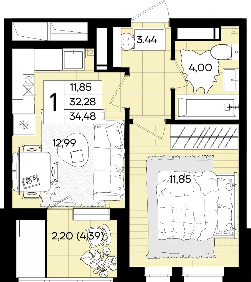 Высота потолков до 3,9 м наполняет пространство светом и воздухом, создавая ощущение свободы.