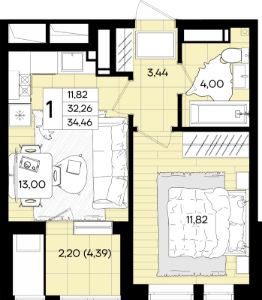 Общая площадь34,68 м²