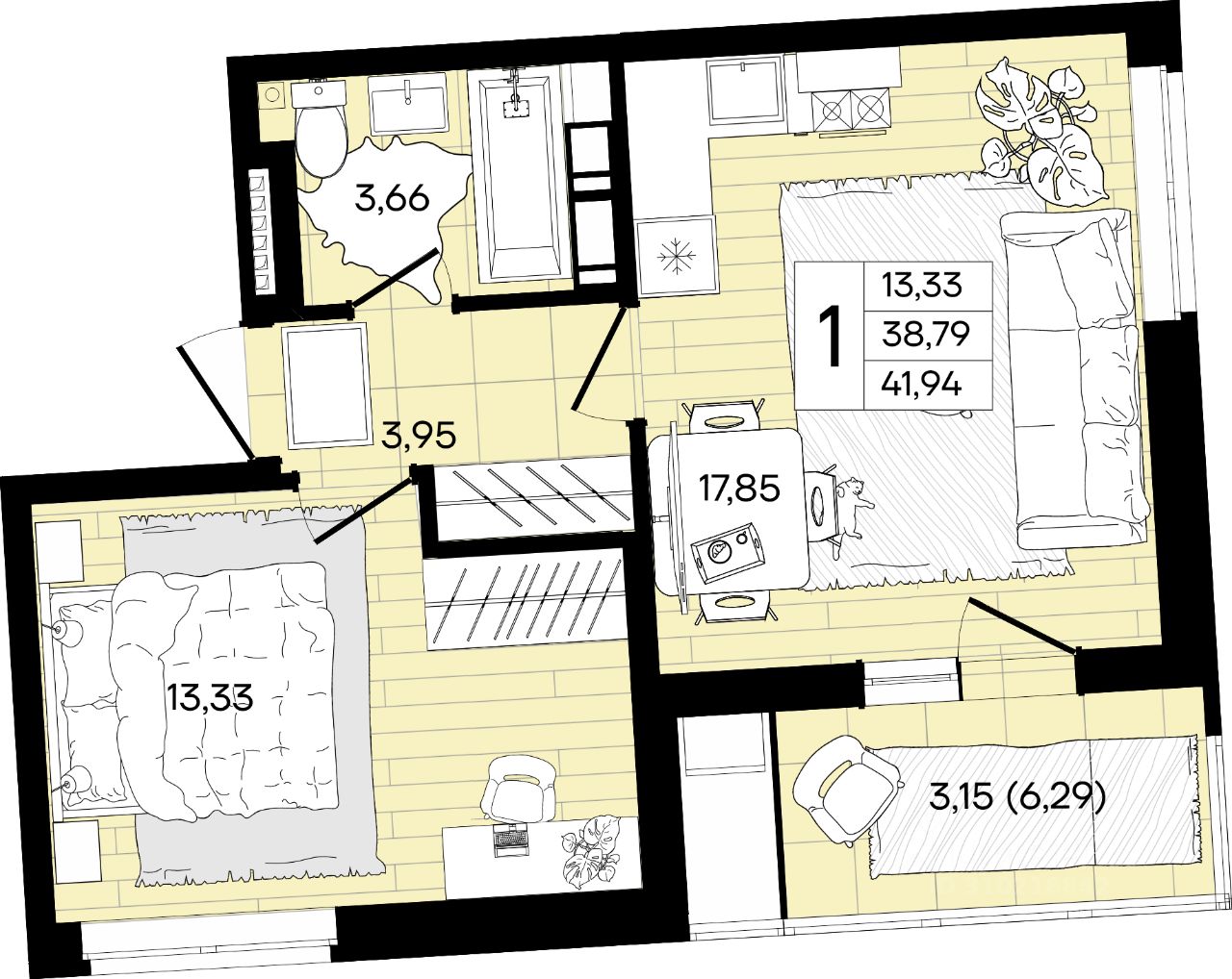 Высота потолков до 3,9 м наполняет пространство светом и воздухом, создавая ощущение свободы.