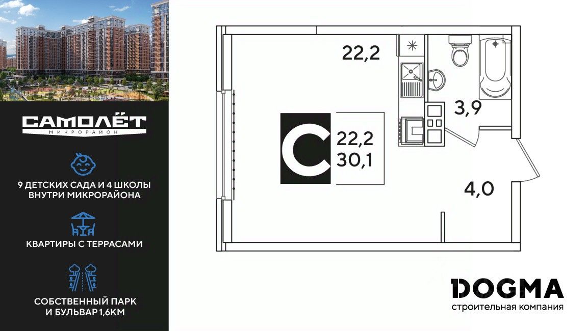 DOGMA - ТОП-3 застройщик по объему строительства в РФ. "САМОЛЁТ" — концептуальный жилой микрорайон, который расположен на северо-западе Краснодара, в районе Западного Обхода. Квартал спроектирован как "город в городе", поэтому здесь будет всё для комфортной жизни: современные дома с разными планировками, дороги, школы и детские сады, поликлиника, торговые центры, парки и аллеи. Микрорайон находится далеко от промышленных предприятий, сочетает удобство городской жизни и экологически благоприятную среду. Инфраструктура нового микрорайона: • 4 школы и 9 детских садов на территории микрорайона • Функциональные планировки • Собственный бульвар протяжённостью 1,6км • Светомузыкальный фонтан протяжённостью 55 метров • Амфитеатр • Парк 7 ГА • Скейт-парк • Детская аква-площадка • Круглосуточное видеонаблюдение и пост охраны Приобрести квартиру можно одним из способов: ипотека, рассрочка, наличный расчет.