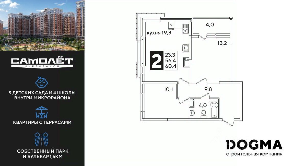 DOGMA - ТОП-3 застройщик по объему строительства в РФ. "САМОЛЁТ" — концептуальный жилой микрорайон, который расположен на северо-западе Краснодара, в районе Западного Обхода. Квартал спроектирован как "город в городе", поэтому здесь будет всё для комфортной жизни: современные дома с разными планировками, дороги, школы и детские сады, поликлиника, торговые центры, парки и аллеи. Микрорайон находится далеко от промышленных предприятий, сочетает удобство городской жизни и экологически благоприятную среду. Инфраструктура нового микрорайона: • 4 школы и 9 детских садов на территории микрорайона • Функциональные планировки • Собственный бульвар протяжённостью 1,6км • Светомузыкальный фонтан протяжённостью 55 метров • Амфитеатр • Парк 7 ГА • Скейт-парк • Детская аква-площадка • Круглосуточное видеонаблюдение и пост охраны Приобрести квартиру можно одним из способов: ипотека, рассрочка, наличный расчет.
