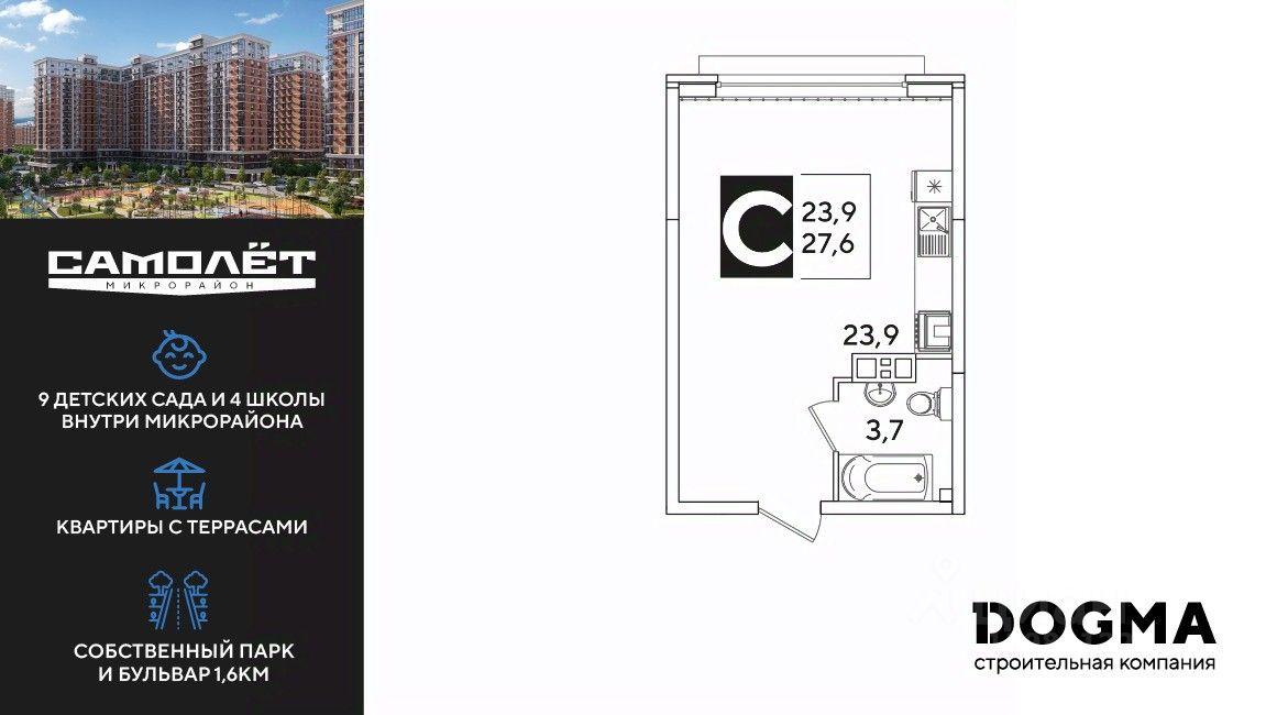 DOGMA - ТОП-3 застройщик по объему строительства в РФ. "САМОЛЁТ" — концептуальный жилой микрорайон, который расположен на северо-западе Краснодара, в районе Западного Обхода. Квартал спроектирован как "город в городе", поэтому здесь будет всё для комфортной жизни: современные дома с разными планировками, дороги, школы и детские сады, поликлиника, торговые центры, парки и аллеи. Микрорайон находится далеко от промышленных предприятий, сочетает удобство городской жизни и экологически благоприятную среду. Инфраструктура нового микрорайона: • 4 школы и 9 детских садов на территории микрорайона • Функциональные планировки • Собственный бульвар протяжённостью 1,6км • Светомузыкальный фонтан протяжённостью 55 метров • Амфитеатр • Парк 7 ГА • Скейт-парк • Детская аква-площадка • Круглосуточное видеонаблюдение и пост охраны Приобрести квартиру можно одним из способов: ипотека, рассрочка, наличный расчет.
