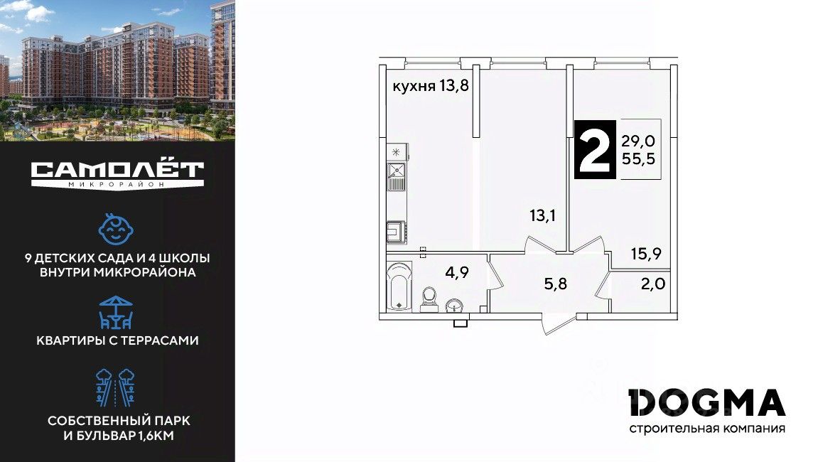 DOGMA - ТОП-3 застройщик по объему строительства в РФ. "САМОЛЁТ" — концептуальный жилой микрорайон, который расположен на северо-западе Краснодара, в районе Западного Обхода. Квартал спроектирован как "город в городе", поэтому здесь будет всё для комфортной жизни: современные дома с разными планировками, дороги, школы и детские сады, поликлиника, торговые центры, парки и аллеи. Микрорайон находится далеко от промышленных предприятий, сочетает удобство городской жизни и экологически благоприятную среду. Инфраструктура нового микрорайона: • 4 школы и 9 детских садов на территории микрорайона • Функциональные планировки • Собственный бульвар протяжённостью 1,6км • Светомузыкальный фонтан протяжённостью 55 метров • Амфитеатр • Парк 7 ГА • Скейт-парк • Детская аква-площадка • Круглосуточное видеонаблюдение и пост охраны Приобрести квартиру можно одним из способов: ипотека, рассрочка, наличный расчет.