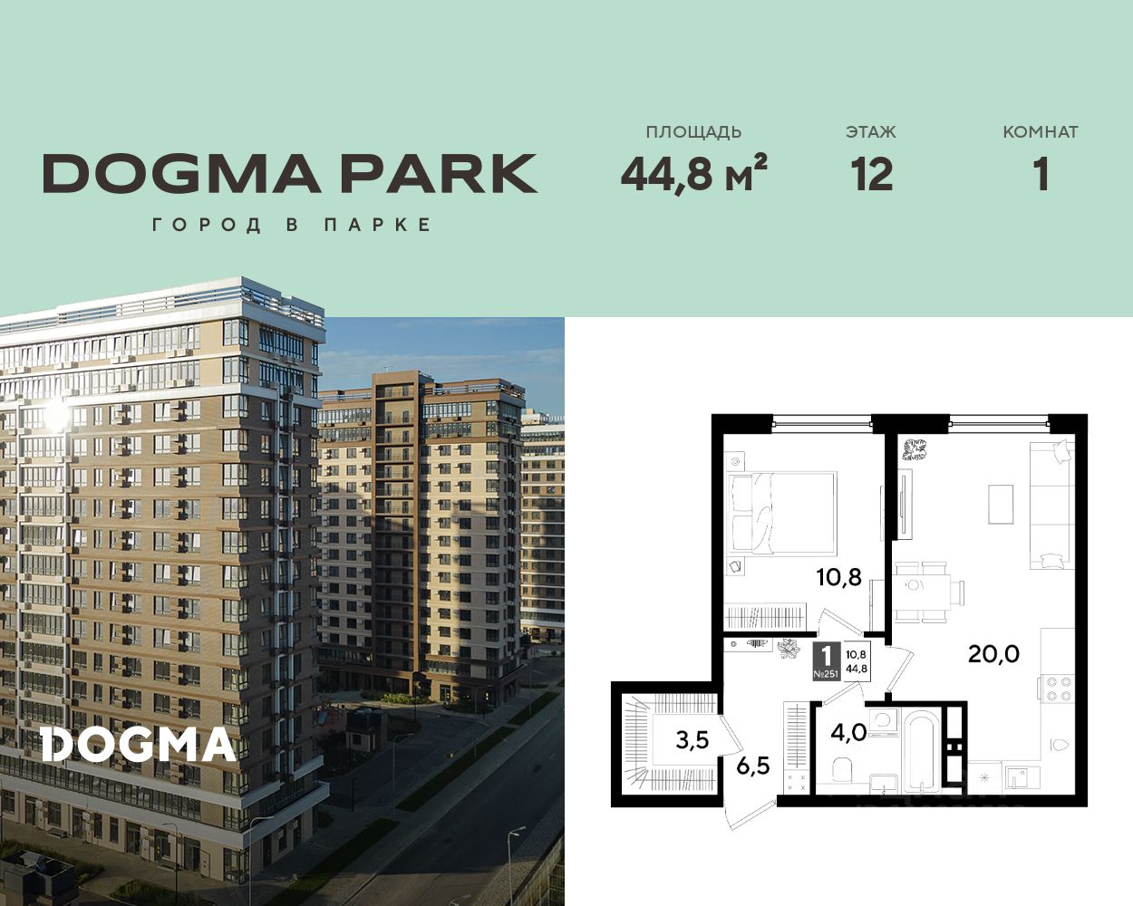 В продаже 1-комнатная квартира от застройщика! Мкр. "DOGMA PARK" г. Краснодар, Литер 35 Срок сдачи: 4 кв. 2027, общей площадью 44.8 кв.м., на 12 этаже.