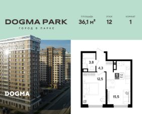 В продаже 1-комнатная квартира от застройщика! Мкр. "DOGMA PARK" г. Краснодар, Литер 34 Срок сдачи: 4 кв. 2027, общей площадью 36.1 кв.м., на 12 этаже.