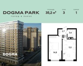 В продаже 1-комнатная квартира от застройщика! Мкр. "DOGMA PARK" г. Краснодар, Литер 36 Срок сдачи: 4 кв. 2027, общей площадью 35.2 кв.м., на 3 этаже.