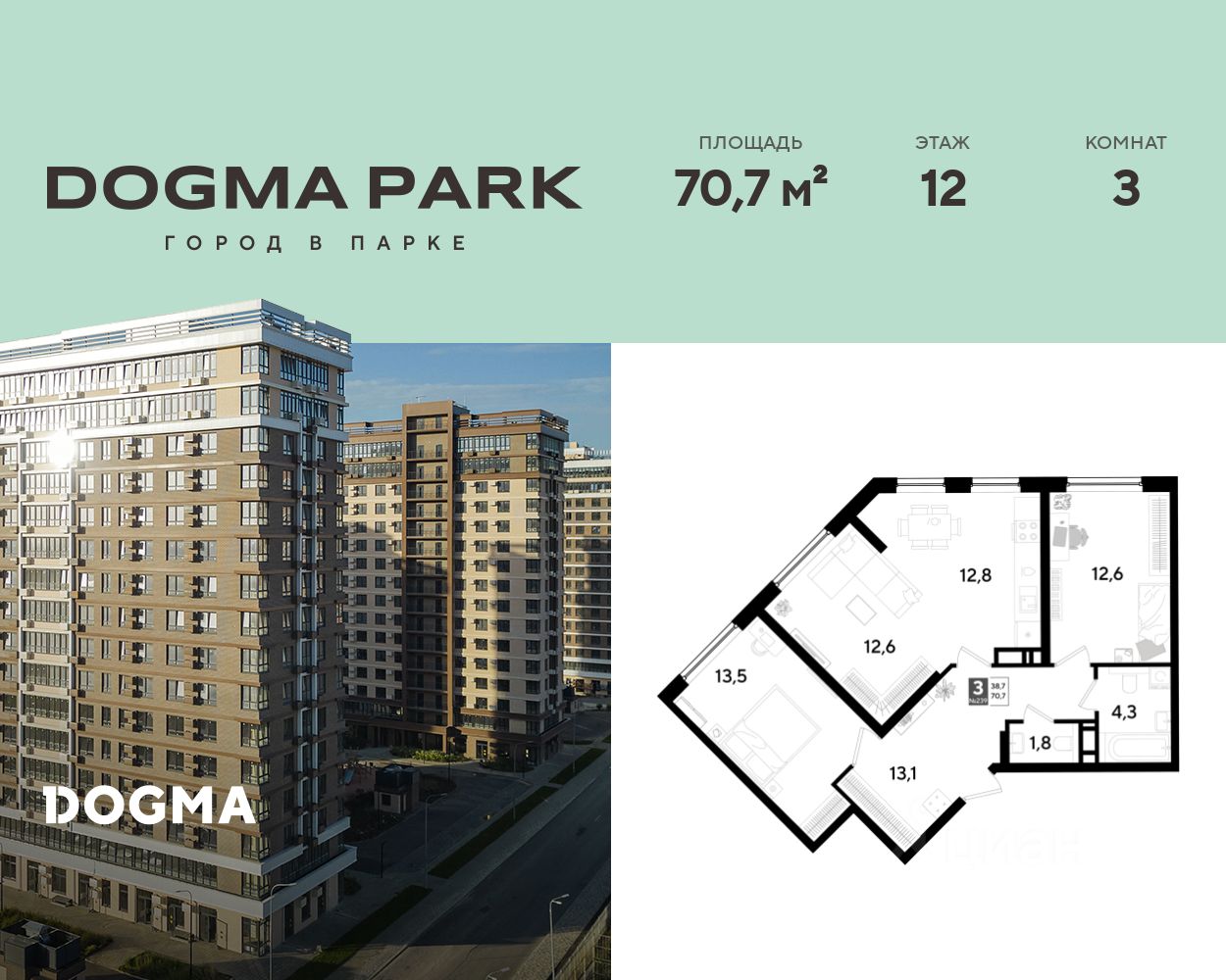 В продаже 3-комнатная квартира от застройщика! Мкр. "DOGMA PARK" г. Краснодар, Литер 30 Срок сдачи: 3 кв. 2027, общей площадью 70.7 кв.м., на 12 этаже.
